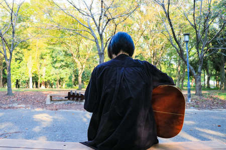 Portrait of young Asian man with deep red long hair in traditional clothes looking at camera