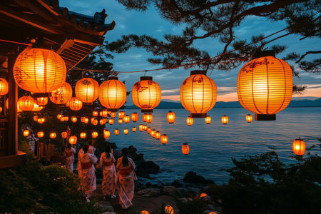 a traditional Obon dance performed at night, participants wearing yukatas dancing in a circle under glowing lanterns, a serene evening sky enhancing the scene