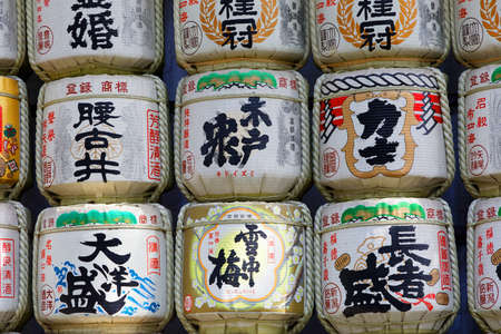TOKYO - MARCH 5, 2016: Close up of multiple stacked Sake barrels in front of Meji Jingu shrine