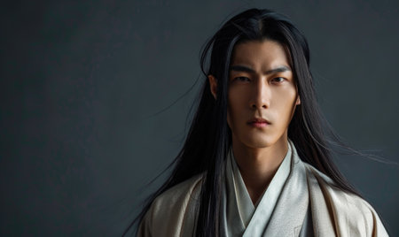 Portrait of young Asian man with dark long hair in traditional clothes looking at camera