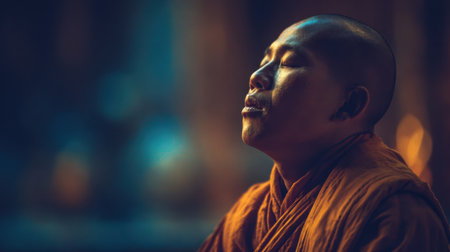 Closeup of a monk, dd in saffron robes, with his eyes closed and head tilted upwards, fully immersed in the sacred chant he is leading
