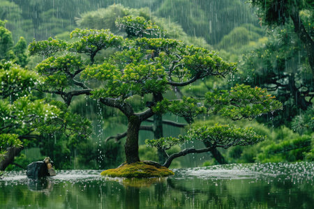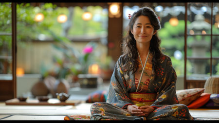A woman performing a tea ceremony ritual in a tranquil Japanese setting with traditional elements