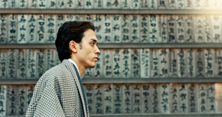 Outdoor, walking and wall with man, Japan and calligraphy with peace, choice and thinking. Person, calming and guy with traditional clothes, travel and decision with thoughts, wonder and aesthetic