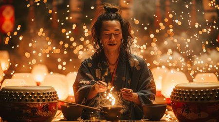 A traveler enjoying a traditional tea ceremony during the Bon Odori festival in Japan, surrounded by the flickering flames of lanterns and the rhythmic beats of taiko drums.