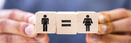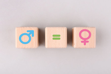Equality concept using gender symbols on wooden blocks representing men and women, equal rights