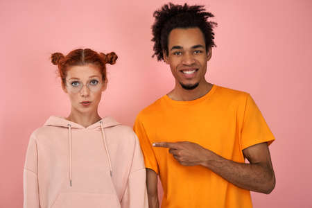 Happy African American man points thumb on sad disappointed ginger woman who feels offended and insulted, disagrees with someones opinion. Ethnic couple express different emotions, pose over pink wall