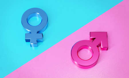 Male, female sex sign. Gender symbols illustration. Mars and Venus signs. 3D rendering. Pink an blue background.