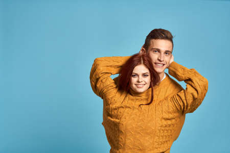 couple in love in yellow sweater posing against blue background cropped view Copy Space