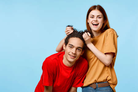 Naughty cheerful young woman with a toothy smile. The female with long blue pigtails laughs happily. A young male stands beside her. Love, relationships. Selective focus.