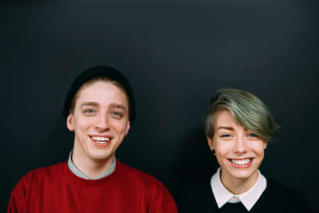 smiling hipster couple. portrait of young teenage man and woman. youth lifestyle and fashion styles. girlfriend and boyfriend on dark background