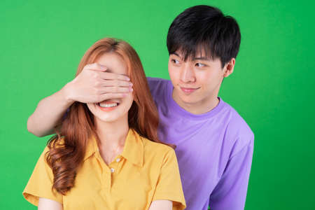 Young Asian couple posing on green background
