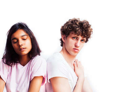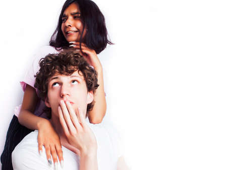 best friends teenage girl and boy together having fun, posing emotional on white background, couple happy smiling, lifestyle people concept, blond and brunette multi nations