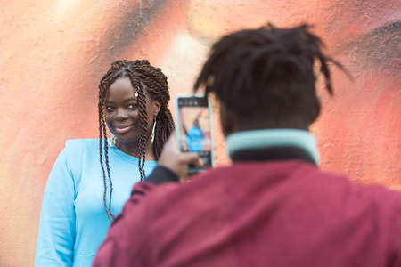 Black guy taking a photo with his mobile of his girlfriend.