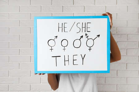 Woman holding sign with gender pronouns and symbols near white brick wall