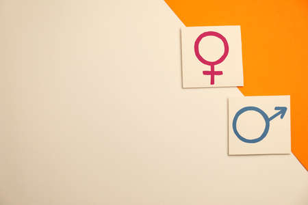 gender equality. Cards with male and female symbols on color background, flat lay. Space for text