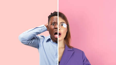 Shocked man, astonished woman. Fun and creative combination of portraits of young people with different emotions, various facial expression on splited multicolored background. Copyspace for ad.