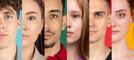 Cropped portraits of young multiethnic men and women on multicolored background. Collage made of 6 models. Concept of youth, unity, equality and diversity