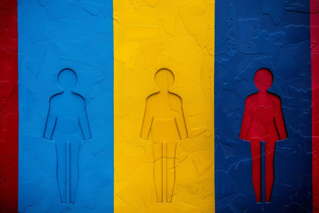 A bright wall features three striking silhouettes representing different genders, highlighted in bold blue, yellow, and red colors. This artistic display promotes diversity in an urban environment.