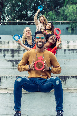 Handsome transgender teenager tearing the word Female into MALE in Gender identity, equality and human rights. Breaking silence about own gender identity transgender Pride and freedom concept.