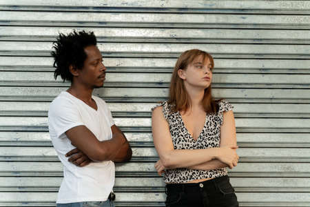 Young multi-race couple having unhappy moments showing displeasure and annoyance.