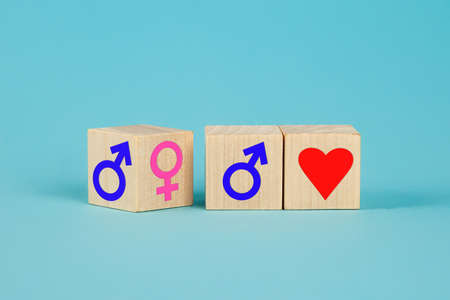 Symbols for feminine and masculine on wooden cubes, pink and blue colored background, stereotpye