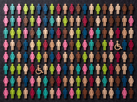 A neatly arranged grid of colorful wooden people figures on a dark textured background features men women and wheelchair users representing diversity and societal inclusion.