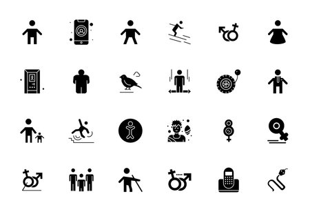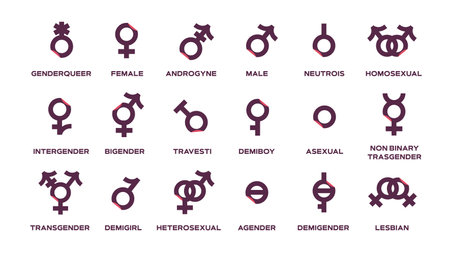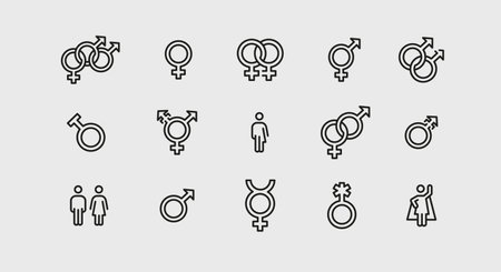 Gender symbols icons. Set of 15 trendy minimal gender-related icons. Example: Male Symbol, Female Symbol, Intersex, Gender Equality icons. Design signs for web page, infographics. Vector illustration
