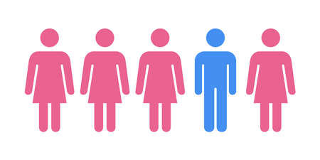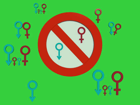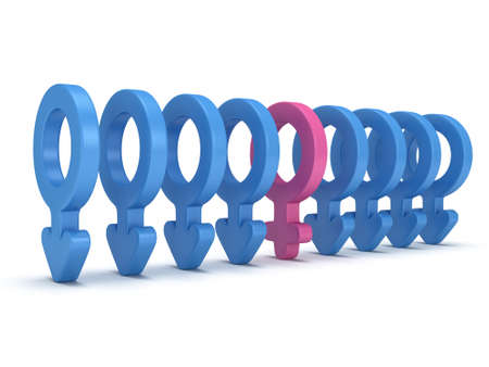 Female sign in row of Male signs on white background. 3D render. Gender, sex, love, man and woman concept.