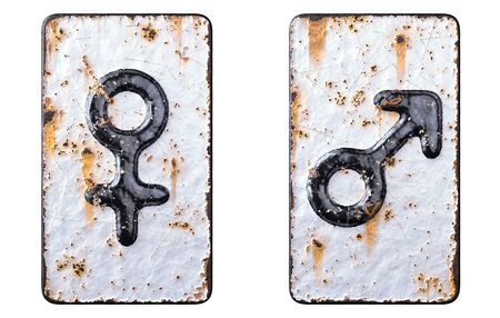 3D render set of symbols female and male made of forged metal on the background fragment of a metal surface with cracked rust. 3d rendering