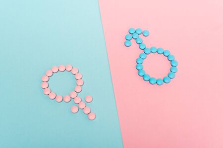 High angle view of female and male signs from hormonal pills on blue and pink background