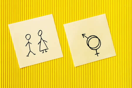 Symbol of man and woman in hands on color stickers. The concept of psychology of relationships. Toned