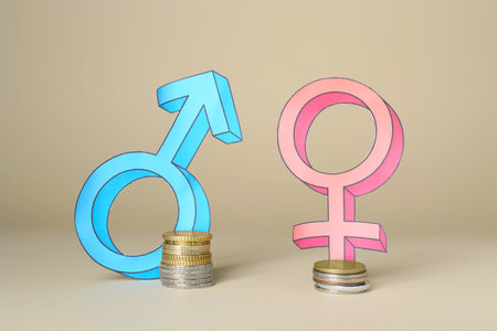 gender pay gap. Male and female symbols near piles of coins on beige background