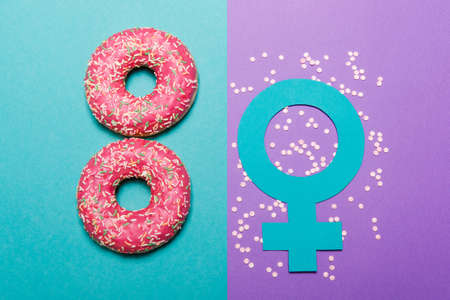 International Women's Day. Postcard for March 8. Flat lay.The gender symbol of Venus. Donuts in the form of number 8.