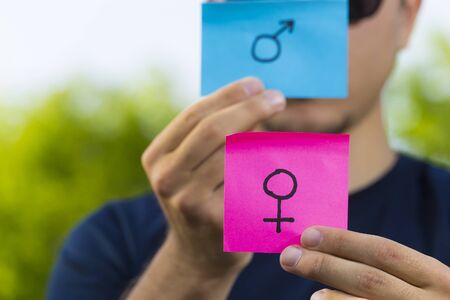 Symbol of man and woman in hands on color stickers. The concept of psychology of relationships. Toned