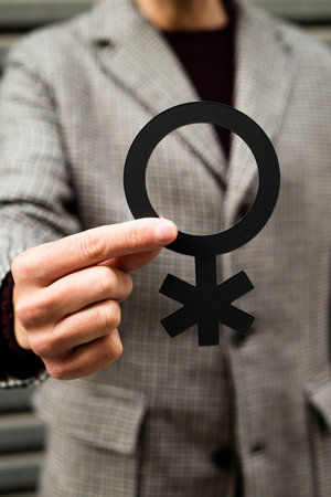 A man holding the male and female symbol on a purple background, gender equality and fighting for women's rights and equality