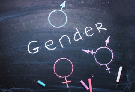 The word gender and symbols of man, woman, transgender drawn in chalk on a blackboard