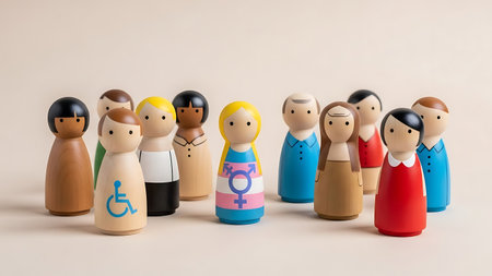 This image displays a collection of wooden figurines, each representing diverse individuals. The figurines include people with different hair colors, skin tones, and disabilities, symbolizing inclusivity and unity. One figurine has a wheelchair symbol, another wears a hijab, and one features a gender symbol, emphasizing diversity and acceptance.