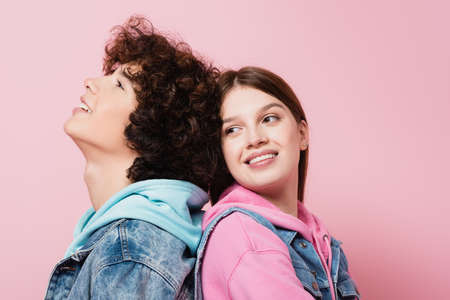 Curly boy standing near smiling teen girlfriend isolated on pink