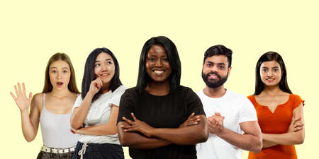 Group portrait of emotional people on yellow studio background. Flyer, collage made of 5 models. Concept of human emotions, facial expression, sales, ad. Successful hands crossing, smiling, shocked.