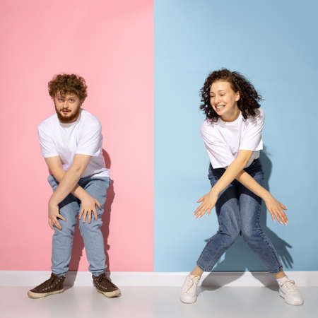 Emotional couple of young funny and happy man and girl dancing hip-hop at studio on blue and pink trendy color background.
