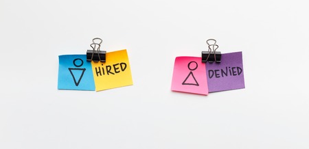 Concept of discrimination between men and women in employment. Man is hired, woman is denied, panorama