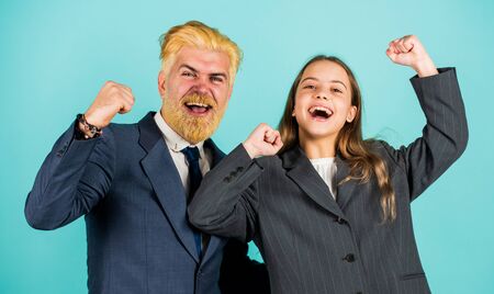 successful business. happy life. businessman dyed blond hair. small girl in oversized jacket. future career. partnership. family teamwork success. dad and daughter feel happiness