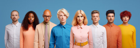 girls and boys stylishly dressed on a blue background. The concept of stylish people. generative ai.