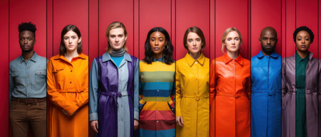 Row of diverse men and women facing sideways with multicolored gradient symbolizing inclusion and equity. Representation of multiracial group.