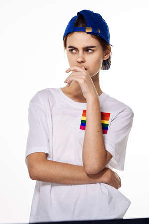 girl in white t-shirt lgbt flag transgender posing light background