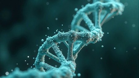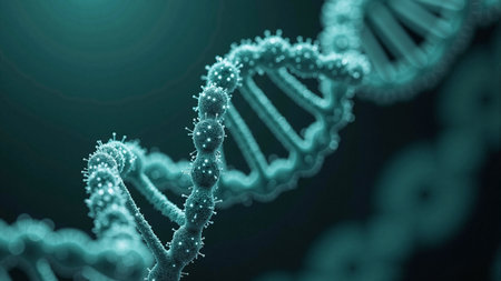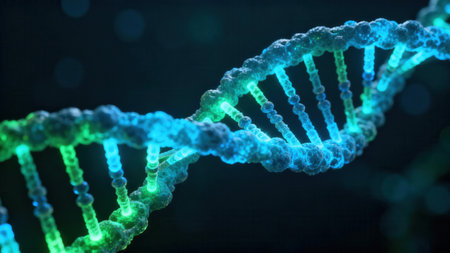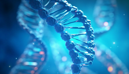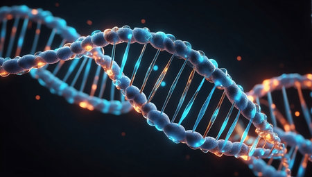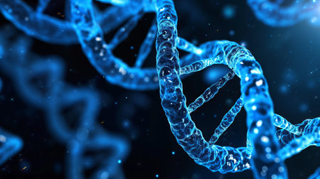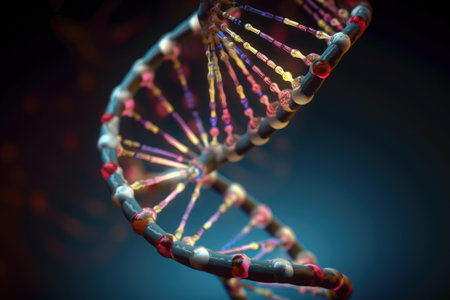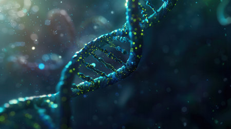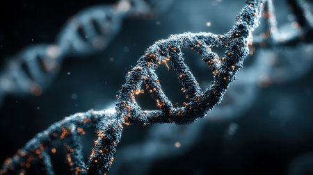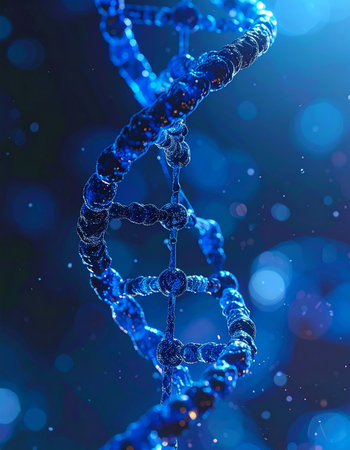 Close up view of DNA double helix structure, showcasing intricate details and glowing elements. image conveys sense of scientific discovery and complexity of genetic material