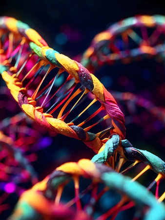 This vibrant close-up image of a DNA helix showcases intricate details and unique structures, highlighting the beauty of molecular biology and genetics.