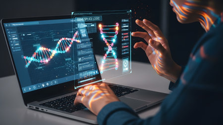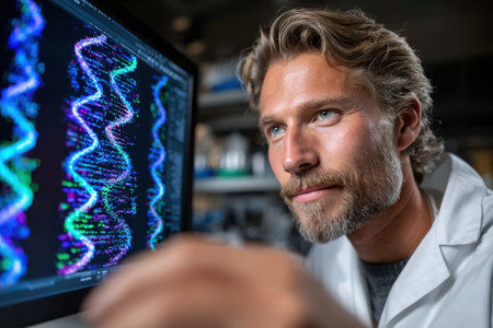 A researcher examines vibrant genetic sequences on a screen while working in a high-tech laboratory.