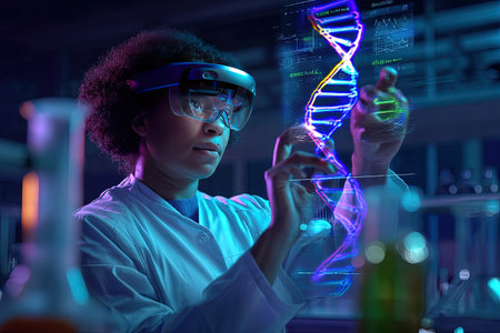 Female scientist wearing an AR headset interacting with a holographic DNA structure. The female scientist engages with a holographic DNA model, blending technology and biology in her lab.