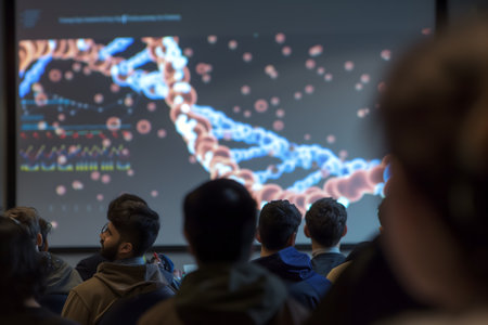 Students attentively watch a scientific film about DNA on a large screen, the educational environment fosters learning and curiosity about genetic material